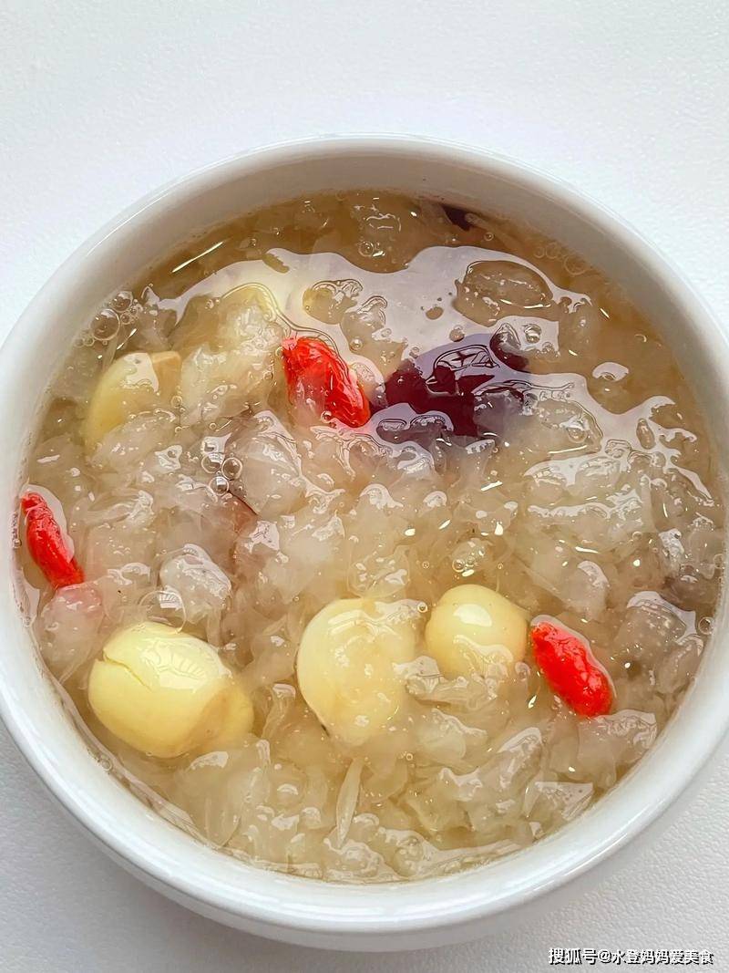 - 加枸杞和冰糖再炖 10 分钟,放凉后冷藏,夏天吃像果冻一样解暑。